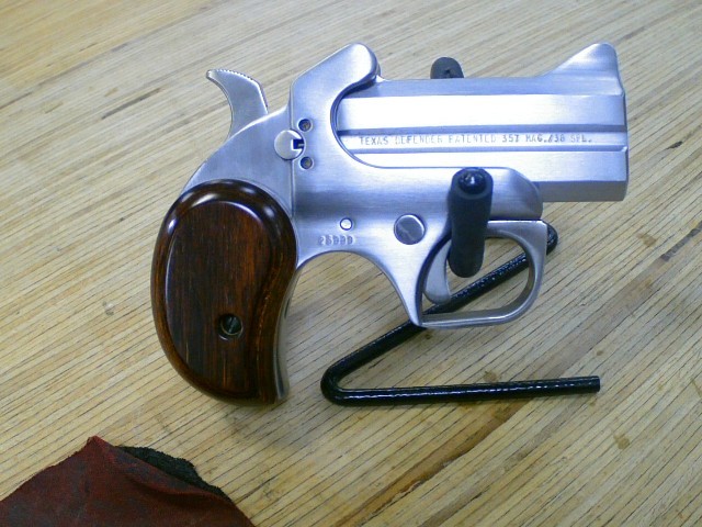 Bond Arms model Texas Defender Derringer. Chambered in .357 Mag and .38 SPL. Comes with a 3" Barrel. This is a used firearm. Use pictures for accurate description. If you have any questions or need more detailed pictures, please contact us.