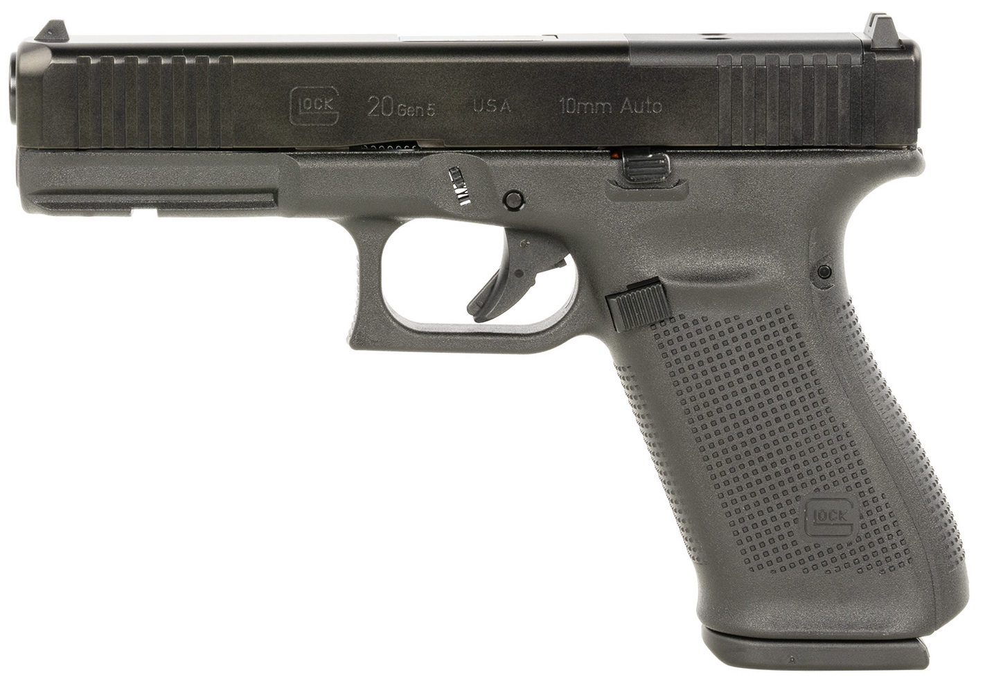 The G20 Gen5 MOS. Gen5 features flared mag-well has a larger funnel; Glock Marksman Barrel (GMB) more aggressive polygonal rifling with a target-style crown and tighter chamber specs; ambidextrous slide stop levers offer increased ergonomics for left-hand shooters and shooting with the support hand; removal of finger grooves; Safe Action System, safeties disengage sequentially as the trigger is pulled and automatically re-engage when the trigger is released; enlarged floor plate makes it easier to pull the magazine free of the pistol and customizable frame size with backstraps in two sizes with beavertail. The multiple backstrap frame allows the users to change the circumference of the grip to fit their individual hand size. MOS features a slide that is precision machined to provide a mounting system for popular optic sights. With multiple adapter plates (sold separately), you can quickly and easily mount miniature red dot sights. Includes one adapter plate, three magazines, mag loader, cleaning kit, pistol case and gun lock