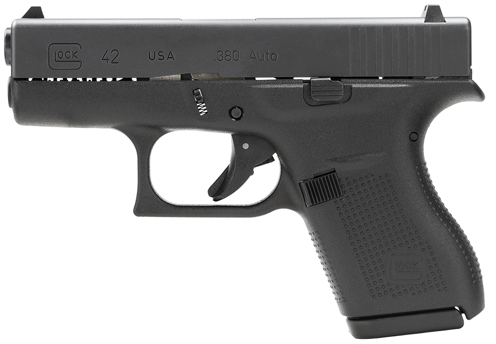 The Glock 42 is the smallest GLOCK possible with ultra-compact dimensions and easy-to-shoot characteristics. It features Glock's Safe Action system which provides a consistent trigger pull from the first to the last round. The three automatic independently operating mechanical safeties are built into the fire control system of the pistol. All three safeties disengage sequentially as the trigger is pulled and automatically reengage when the trigger is released. The frame is made of polymer with hardened steel guides. It features an ideal grip angle and low weight. The slide stop lever and the magazine catch are easily operated with the shooting hand. The advanced surface treatment of the slide results in optimal hardness by considerably reducing wear and tear and it makes it corrosion resistant, even when operating in saltwater conditions. The matte surface minimizes light reflection. The barrel is mechanically locked and cold-hammer forged. It also has the same advanced surface treatment as the slide. Its extractor serves as a loaded chamber indicator to comply with the laws of certain states and its position may visually and physically indicate whether there is a cartridge in the chamber of the pistol.
