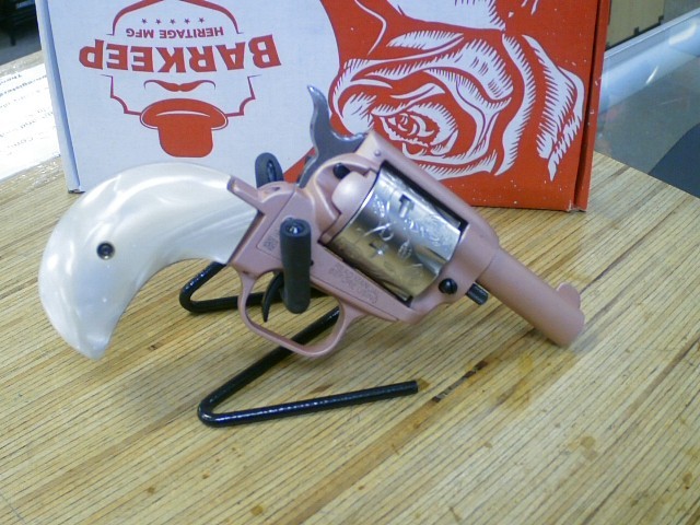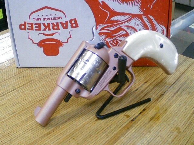 Heritage Arms model Barkeep,Rose edition, single action revolver. Chambered in 22LR. Comes with a 2" barrel and original box. This is a used firearm. Use pictures for accurate description. If you have any questions or need more detailed pictures, please contact us.