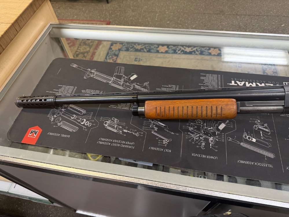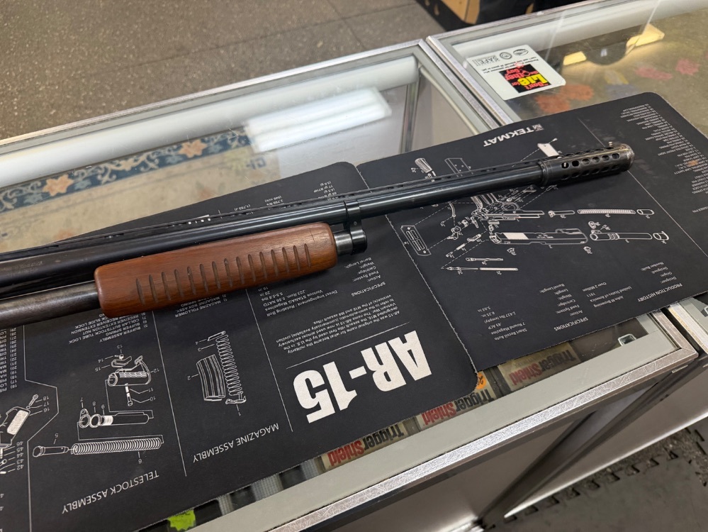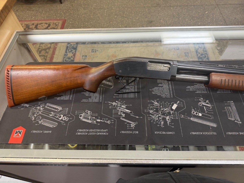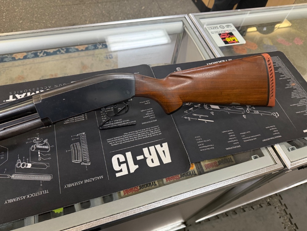JC Higgins model 20 pump action shotgun. Chambered in 12GA. Comes with a 22.5" barrel, fixed choke and 2 3/4" chamber. This is a used firearm. Use pictures for accurate description. If you have any questions or need more detailed pictures, please contact us.