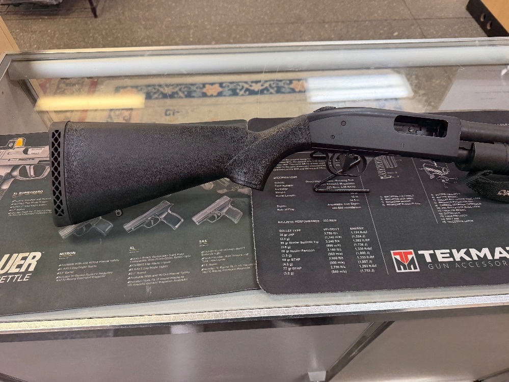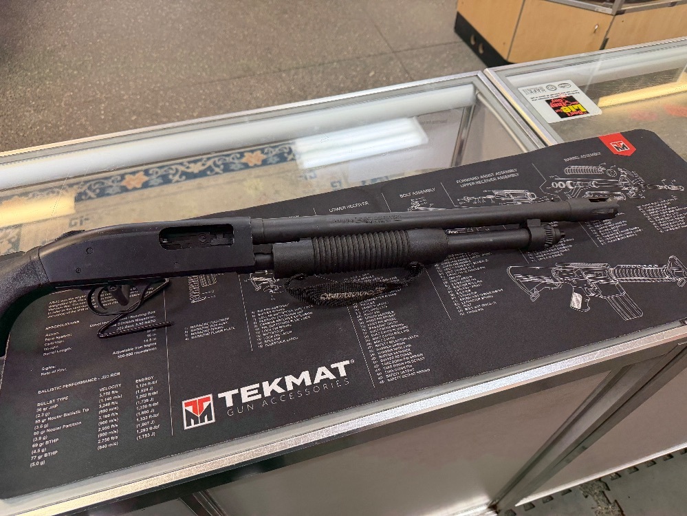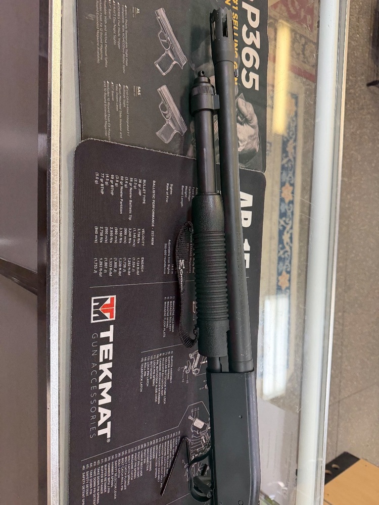 Mossberg model 590 pump action shotgun , chambered in 12GA. Comes with a 18.5" barrel, 3" chamber and fixed choke. This is a used firearm. Use pictures for accurate description. If you have any questions or need more detailed pictures, please contact us