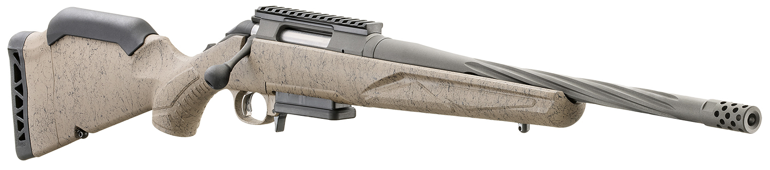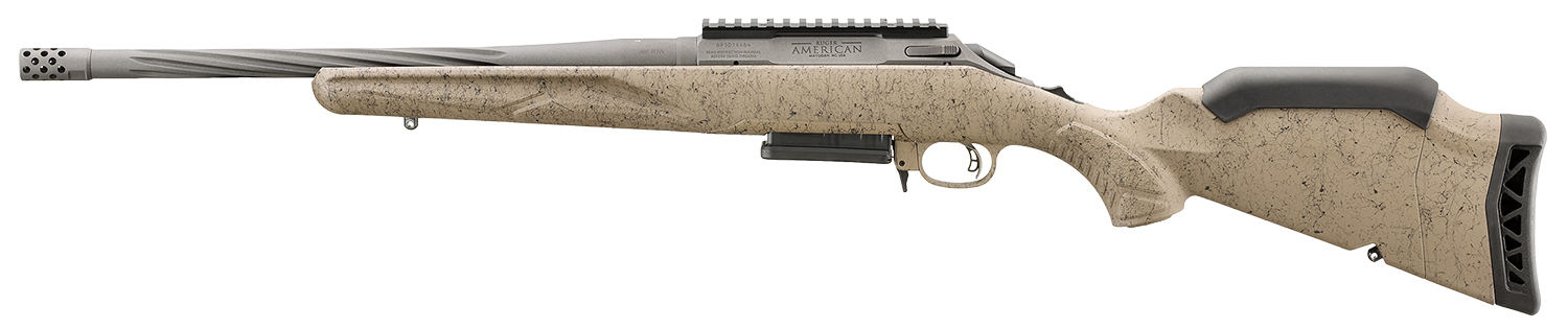 The Ruger American Ranch Gen II features a splatter finished stock with a soft rubber recoil pad, removing the installed spacer allows for length of pull to be adjusted from 12" to 13.75"; installed low comb improves sight alignment when using magnified optics but can be removed when utilizing low-mounted sights; Cerakote coating on barrel, muzzle brake, receiver and bolt handle results in a durable, easy-to-maintain finish; compact, threaded barrel with factory-installed Ruger Hybrid Muzzle Brake is cold hammer-forged; Ruger Marksman Adjustable trigger; patented Power Bedding integral bedding block system positively locates the receiver and free-floats the barrel for outstanding accuracy; one-piece bolt is CNC machined from stainless steel for smooth operation and the familiar three-lug design with 70 degree throw provides ample scope clearance; oversized bolt handle for positive bolt manipulation; installed Picatinny scope base. Includes magazine and steel sling swivel studs.