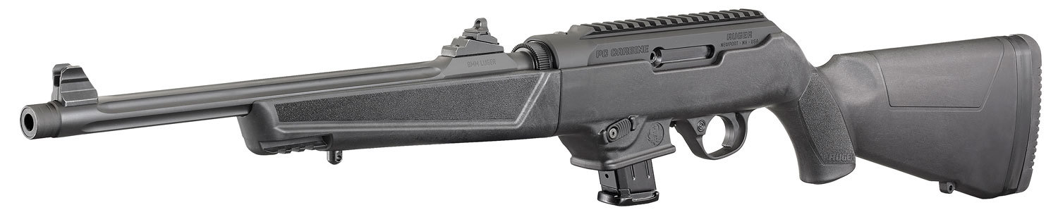 Ruger's PC Carbine rifle features interchangeable magazine wells for use of common Ruger and Glock magazines. Its Dead blow action features a custom tungsten dead blow weight that shortens bolt travel and reduces felt recoil and muzzle rise. The cold hammer-forged, chrome-moly steel barrel is also heavy contoured with fluting. The durable, glass-filled nylon synthetic stock features sling swivel studs, soft rubber buttpad with spacers, and the grip has a proprietary texture for enhanced control. The CNC-milled aerospace-grade 7075-T6 aluminum billet receiver includes an integrated Picatinny rail and adjustable ghost ring rear and blade front sights. The PC Carbine also has a light, crisp trigger pull and ambidextrous controls.This model ships with SR-Series Pistol and Security-9 magazine well installed, and includes an additional magazine well accepting Glock compatible magazines. New Hand Guard Free FloatedNOTE: Older Glock magazines that feature only one magazine latch slot may still be used with the PC Carbine, but the magazine release button must remain on the left side of the rifle as shipped from the factory as the magazine will not properly lock into the magazine well. New Free floated hand guard