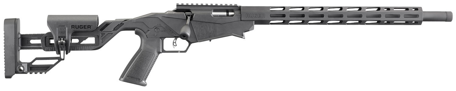 Ruger's Precision Rimfire rifle features a molded, one-piece chassis and a Quick-Fit adjustable buttstock assembly manufactured with glass-filled nylon for strength, stiffness and stability, making a solid foundation. The adjustable buttstock also has a flat Picatinny bag rider, molded-in window which provides a tether point for your squeeze bag, and a metal QD pocket. Its 15" free-float handguard is made of aluminum and features Magpul M-Lok slots on all four sides, while the Picatinny scope base includes 30 MOA elevation. The target, cold hammer-forged, 4140 alloy steel barrel has ultra precise rifling and 1/2"x28 threads with an included thread protector. The Precision Rimfire rifle also has a Ruger Marksman adjustable trigger, AR-pattern pistol grip, safety selector, and an oversized bolt handle. This model includes two, 10-round BX-1 magazines.