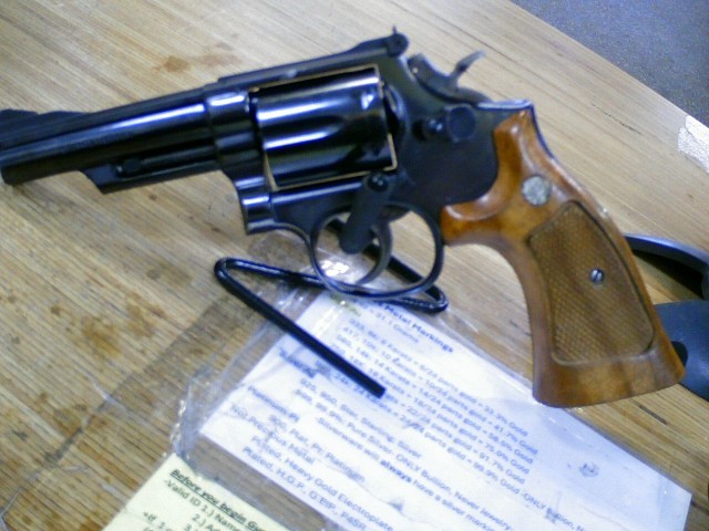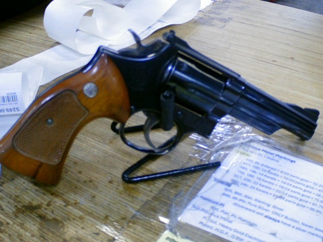 Smith & Wesson model 19-4 double action revolver, chambered in .357 mag. Comes with a 4" barrel. This is a used firearm. Use pictures for accurate description. If you have any questions or need more detailed pictures, please contact us