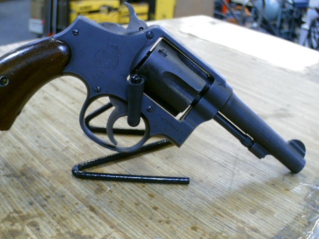 Smith & Wesson model Victory SA/DA Revolver, chambered in .38 SPL. Comes with a 4" barrel. This is a used firearm. Use pictures for accurate description. If you have any questions or need more detailed pictures, please contact us