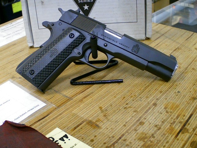 Springfield Armory model 1911 Mil-Spec semi-auto pistol. Comes with a 5" barrel, and original box. This is a used firearm. Use pictures for accurate description. If you have any questions or need more detailed pictures, please contact us